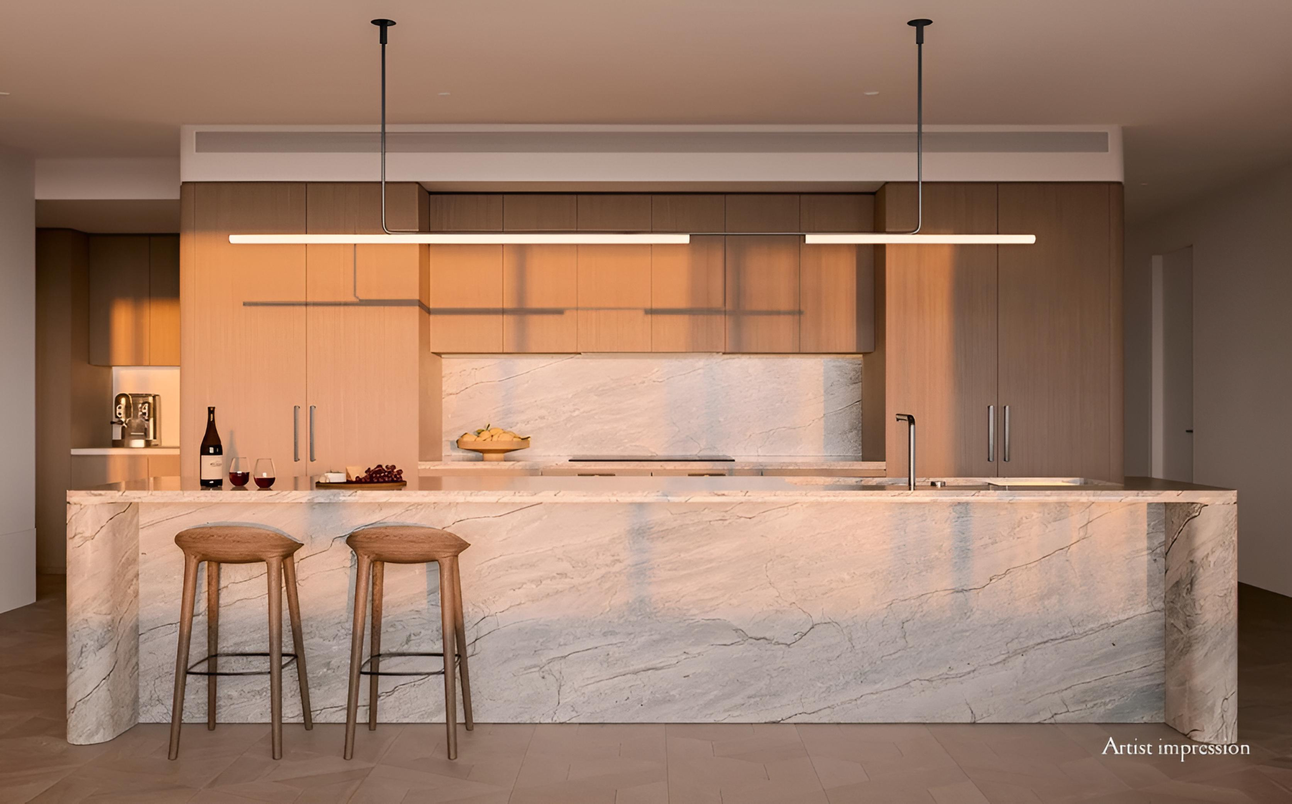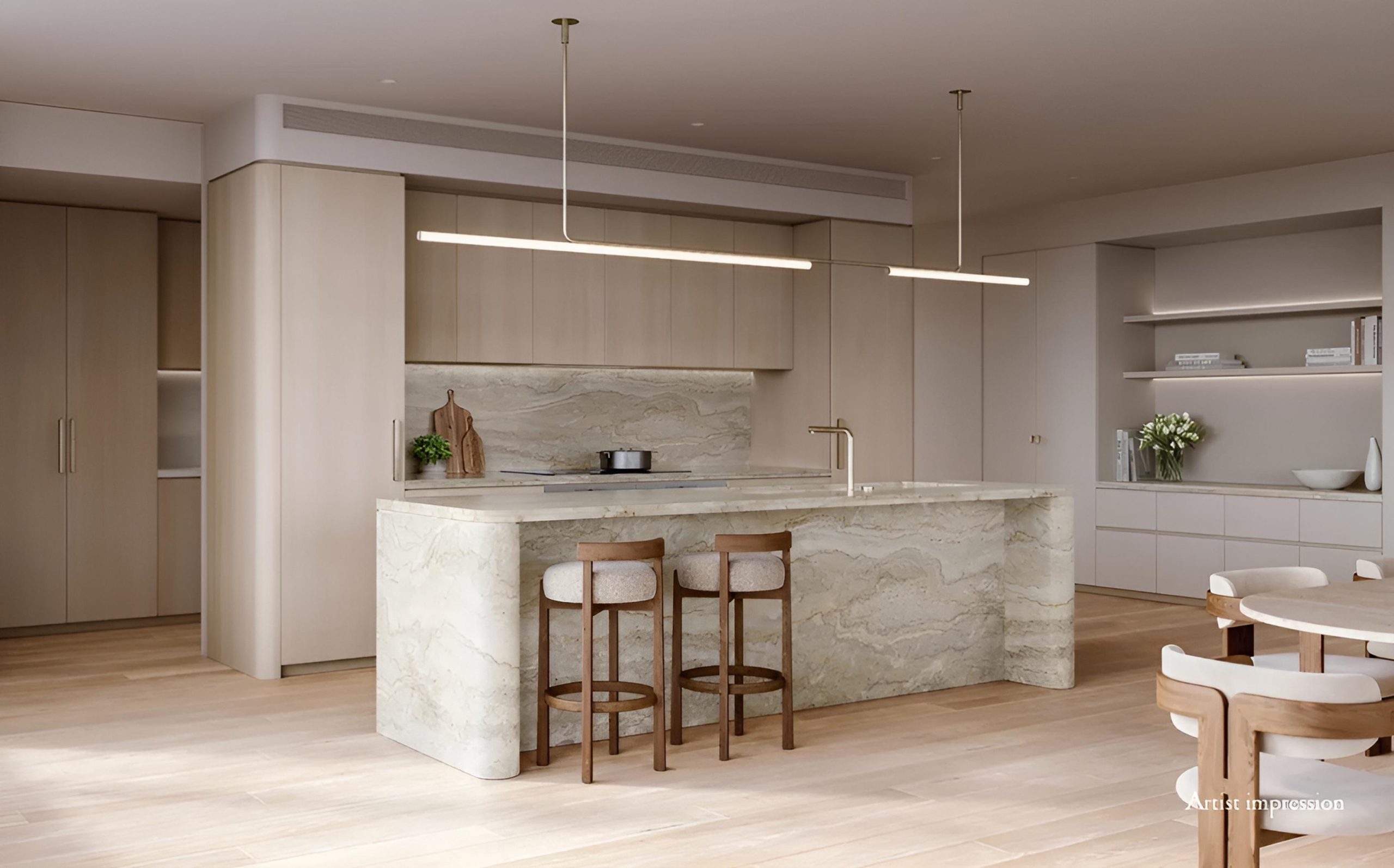 The Culinary Suite: Master-crafted kitchens featuring Gaggenau appliances, natural stone island benches with curved detailing, and integrated butler’s pantries.